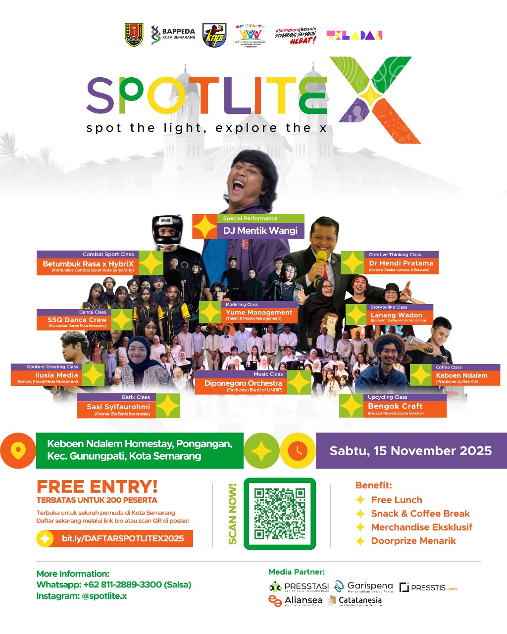 Sebagai ruang regenerasi kreatif, SPOTLITE X menghadirkan 10 kelas tematik dengan mentor profesional dari berbagai bidang. Mulai dari Creative Thinking Class bersama Dr. Hendi Pratama, Storytelling Class oleh Lanang Wadon, hingga Combat Sport Class yang dibina komunitas Betumbuk Rasa x HybriX.